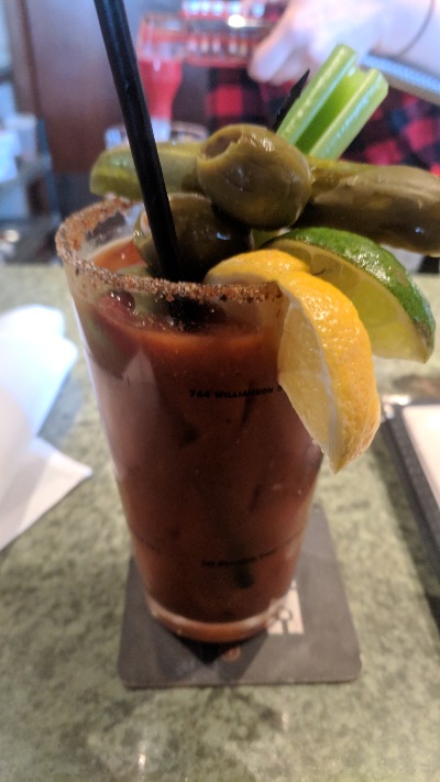 I went with the Killer Murder Bloody, one of three versions available. It was made with chili pepper vodka and was perfect to the last drop. The salad was a great pickled assortment. - Dan S on |